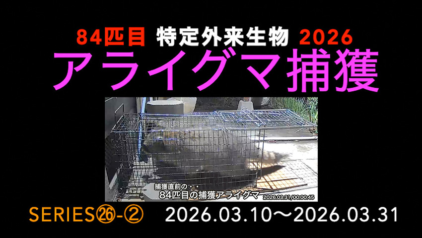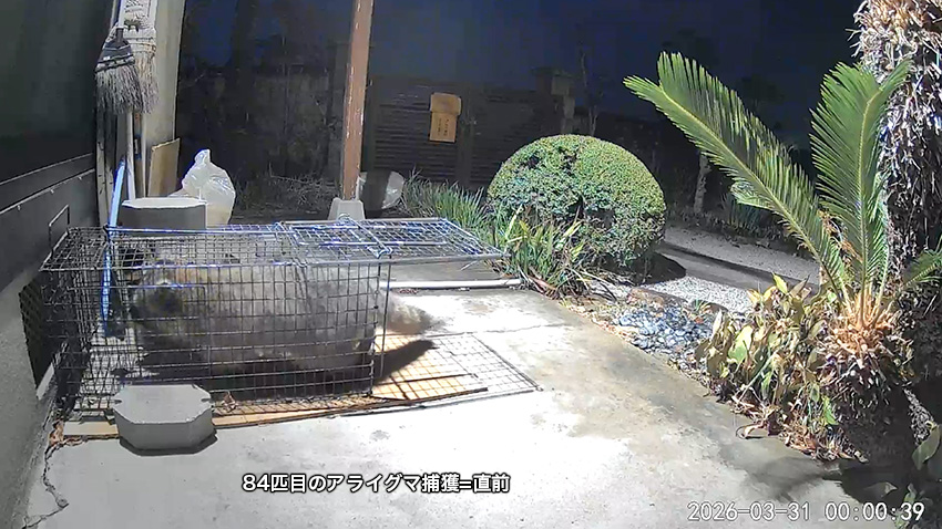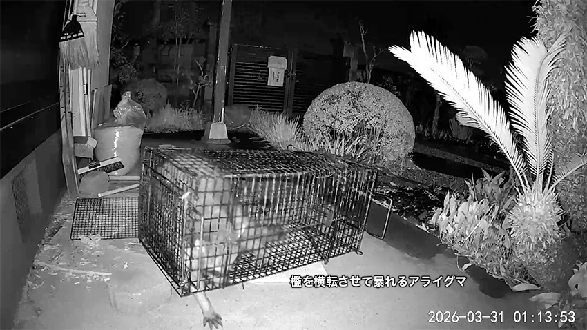 ![]() 動画ビデオのタイトル 静止画像の詳細はこちらへ | ![]() 捕獲の直前 | ![]() 捕獲された後、檻を横転させ暴れる |